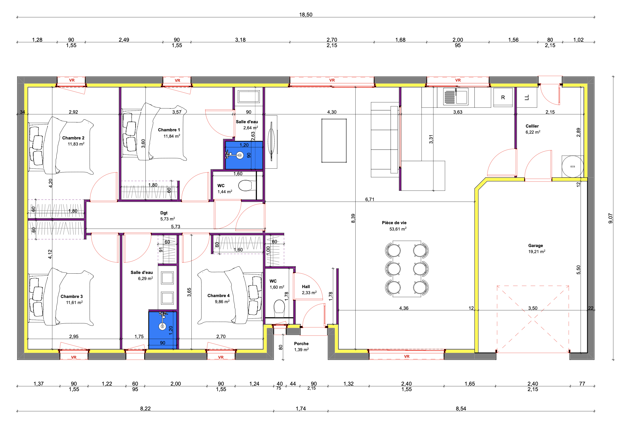 Le modèle 125 R 4 offre une surface habitable de 125 m², pensée pour accueillir les familles avec tout le confort moderne. Avec ses 4 chambres, ses deux salles d’eau et son garage spacieux, cette maison allie fonctionnalité et design contemporain.